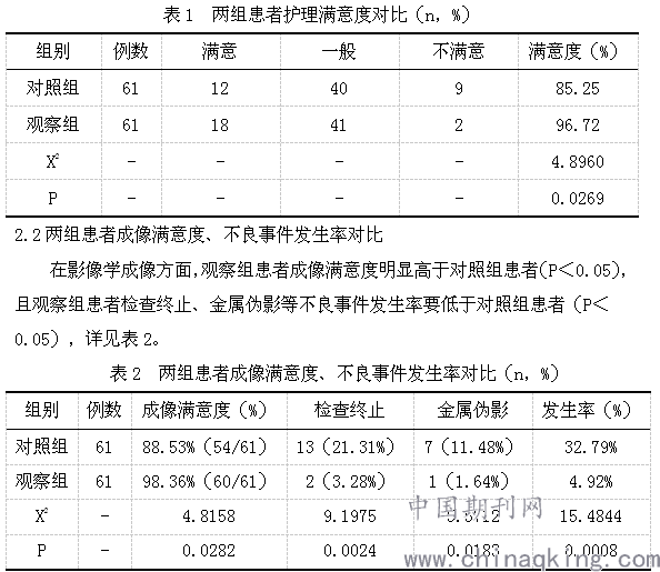 观察组患者接受临床干预配合影像护理,提前了解患者基本病症情况,同时对患者基本信息进行评估,确保患者具有接受MRI检查的指征,同时针对患者实施特定的干预措施。对患者体内安装有金属辅助器械的患者提前告知,同时与主治医生联系,采取其他的检测方式,避免因核磁共振检查影响到患者的身体健康。实施检查前,通过护理人员与患者的交流,向患者介绍检查项目,检查目的、核磁共振检查方式的优越性以及核磁共振检查的安全性。在正式开始检查前,叮嘱患者不能携带金属配饰、检查前30min不能接受输液治疗,对存在焦虑症状的患者通过心理安抚缓解患者焦虑的情绪[2-3]。