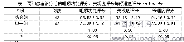 结合组患者治疗后的咀嚼功能评分、美观度评分与舒适度评分均显著高于单一组患者治疗后的咀嚼功能评分、美观度评分与舒适度评分,P<0.05,两组数据差异对比有统计学意义,见表1。