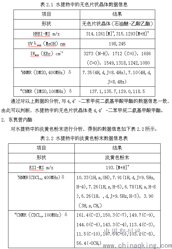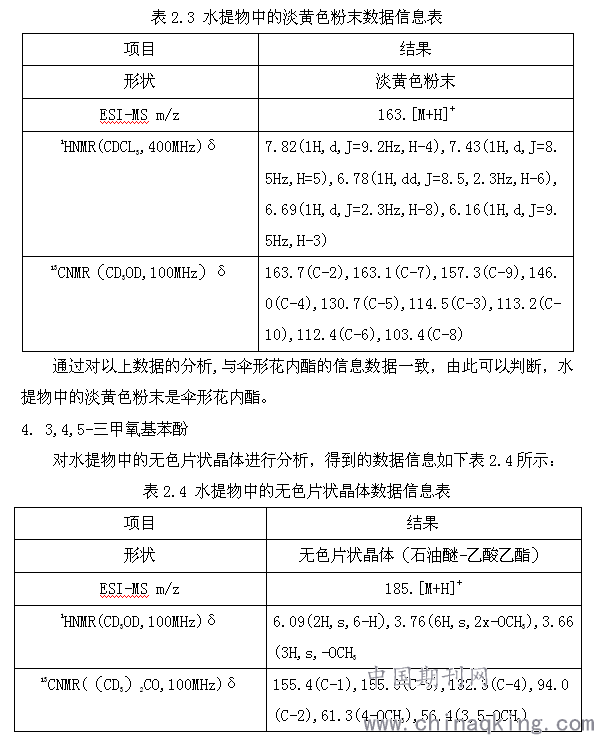 对水提物中的淡黄色粉末进行分析,得到的数据信息如下表2.3所示: