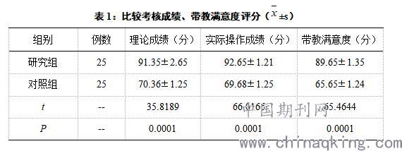 研究组实习护生理论成绩、实际操作成绩、带教满意度分值均高于对照组(P<0.05),见表1: