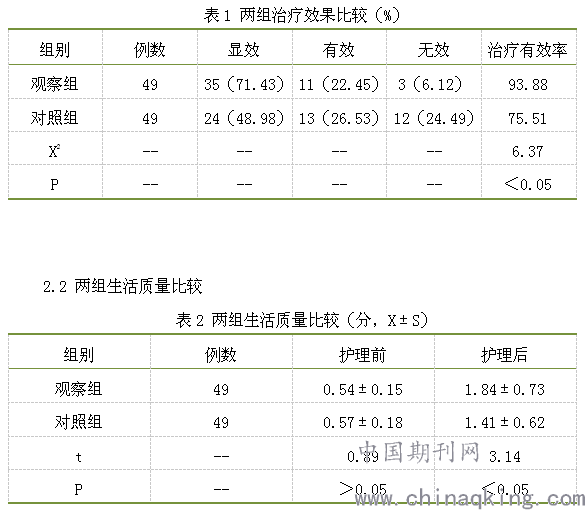 分析表1可知,观察组治疗有效率为93.88%高于对照组75.51%,比较有统计学意义,P<0.05。