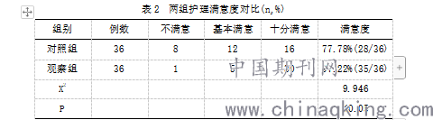观察组护理满意度明显高于对照组,P<0.05。见表2。