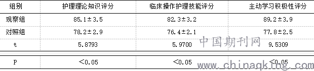 最终评分结果显示,观察组护士通过情景教学联合问题导向教学模式培训后,其护理理论知识掌握度、临床操作护理技能及主动学习积极性评分均显著优于对照组数据,二组数据对比差异较大,统计学意义存在(P<0.05),详情见表1。