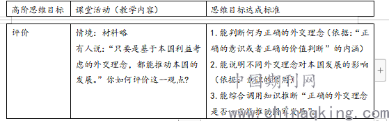 高阶思维能力的培养不是一蹴而就的,而是循序渐进、层层推进的过程。在《意识的作用》一课中,笔者采用“人类命运共同体”议题式教学,对该议题情境进行了结构化处理。呈现了从“情境一的人类命运共同体理念的产生(是什么)”到“情境二的人类命运共同体理念和保护主义思想的作用(为什么)”再到“情境三的怎么评价‘符合国家利益的外交理念’、启示如何做出选择(怎么看、怎么做)”的结构,突出了核心素养水平1-4的发展层次,符合了从低阶思维到高阶思维的发展规律,从而有利于唤醒学生的高阶思维。
