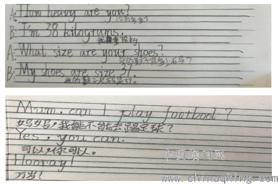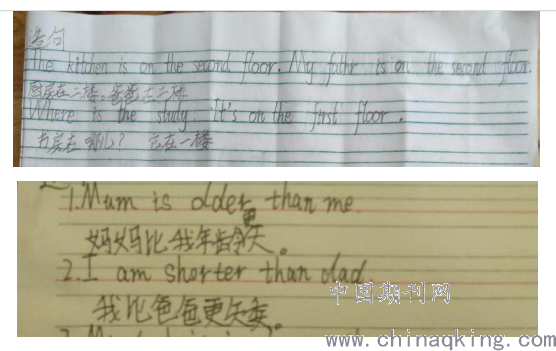 b.每日一段。经过一段时间的每日一句训练以后,学生在英语写作上有了较大的进步,这时开始让孩子们编写一些对话或者一段话。