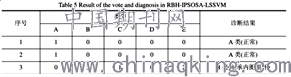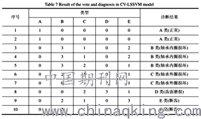 为了更加准确地说明利用BH-PSOSA算法进LSSVM决策模型,对表中齿轮箱的待诊断样行参数寻优后的多分类。LSSVM分类器在故障诊断进行故障的识别分类,参数设置和前面的一样。中性能的优越性,我们再用交叉验证法对LSSVM最后的输出结果、得票情况和诊断结果如下面两个表格所示。