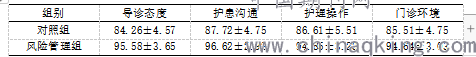 关于各项护理质量指标的评分如下,对照组门诊环境评分为85.51±4.75分,导诊态度为84.26±4.57分,护患沟通评分为87.72±4.75分,护理操作评分为86.61±5.51分。风险管理组门诊环境评分为94.64±3.03分,导诊态度为95.58±3.65分,护患沟通评分为96.62±2.92分,护理操作评分为94.85±3.28分,风险管理组患者对护理质量的评分高于对照组(P<0.05)。见表1。