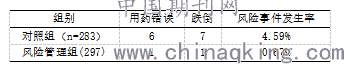 对照组共发生13例风险事件,发生率为4.59%,其中6例用药错误事件,占比为2.12%,7例跌倒事件,占比为2.47%。风险管理组共发生2例护理风险事件,发生率为0.67%,其中1例用药错误事件,占比为0.34%,1例跌倒事件,占比为0.34%。风险管理组护理风险事件发生率明显低于对照组(P<0.05)。见表2。