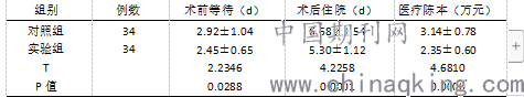 实验组术前等待时间、术后住院时间、医疗成本均小于对照组,P<0.05,见表1。