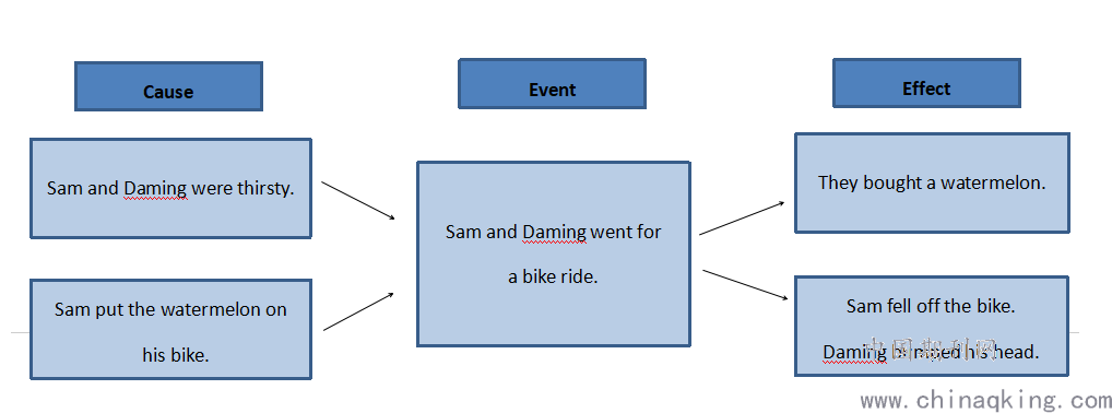 在阅读教学中随时都可以用到思维导图,也可以引导学生自己做思维导图。比如,我在教学四年级下册Module10 Unit1 Did you fall off your bike?时,就使用了Multi-Flow Maps(复流程图)来帮助学生分析、理解课文内容,脉络清晰、因果关系一目了然,学生不仅能很快地了解课文中发生的事情和导致的结果,更能很快地理解、熟悉、记住、复述课文,实在是有事半功倍之效。