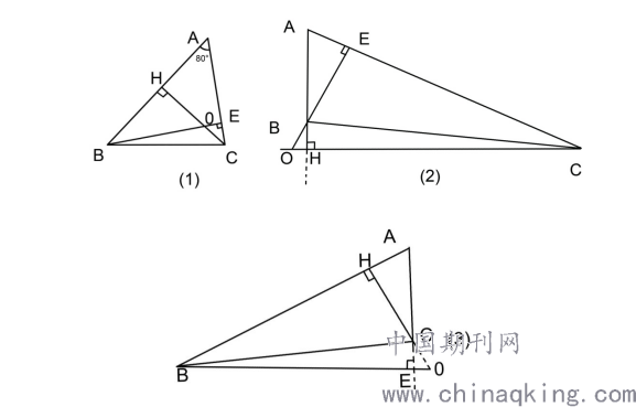 例1:△ABC中,∠A=80°,高BE,CH所在直线交于点O,求∠BOC。