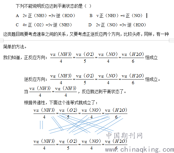 我们知道,同一个反应中各种物质的速率之比等于计量系数之比,即v(NH3):v(O2):v(NO):v(H2O)=4:5:4:6,这种表达方式很容易理解,但是不太好用。例如,v(NH3)=v(O2)还是v(O2)呢,部分数学不太好的学生在这个简单的地方,经常会出现低级错误。