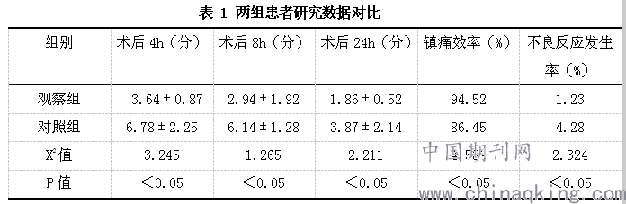 观察组与对照组耳鼻喉患者数据评价以镇痛效果、不良反应发生率、术后4h、术后8h以及术后24h疼痛评分为主要评判标准。