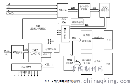 信号处理电路采用了TMS320F206+异步串口SC28L202架构。信号处理电路主要由加速度计信号采集电路、陀螺信号采集电路、测温电路、数字信号处理及控制电路、外设输出接口电路组成。