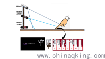 如图所示在最下面的红外一字激光发射出红外线覆盖空间中的一个面,这个平面覆盖整个键盘的范围,在中间的键盘投射激光发出的是键盘形状的轮廓图形,主要用于位置的标定,在最上面的摄像头实时拍摄外界图形并且把数据传递给电脑,因为一字激光发出的光线是和水平面平行的所以没有物体遮挡时摄像头是不能检测到红外线信号的,但是如果有物体在红外一字激光区域中时遮挡物体表面就会覆盖有红外线摄像头就会检测到红外线信号,电脑获取到摄像头发送过来的信号后经过一定的算法处理之后得到红外线亮点在图片中的坐标,然后根据这个坐标使上位机发出相对应的音律。
