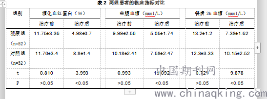 治疗前,两组患者血糖水平均偏高,且比较无明显差异,P>0.05;治疗后,观察组血糖水平明显降低,且均显著低于对照组,P<0.05。见表2。
