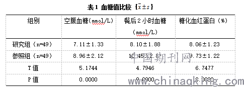 研究组的空腹血糖、餐后2小时血糖和糖化血红蛋白均小于参照组,P<0.05。见表格1。