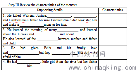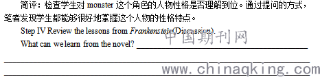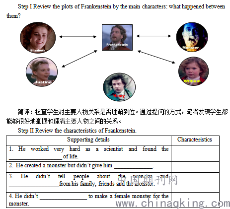 简评:检查学生对Frankenstein这个角色的人物性格是否理解到位。通过提问的方式,笔者发现学生都能够很好地掌握这个人物的性格特点。
