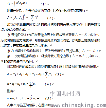 ① 开挖阶段1:开挖前的初始应力状态。其中初始应力 可根据实测地应力或用有限元法计算而加以确定,后者即为围岩的自重应力。通过单元的初始应力,计算其等效节点力: