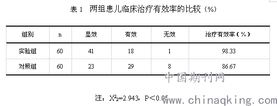 通过上述方法,实验组患儿的临床治疗有效率比对照组患儿要高,差异显著,并且具有统计学意义(X2 =2.943,P<0.05),具体分析见表1: