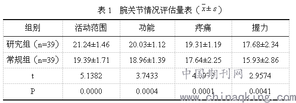 统计分析表1中两组患者的腕关节情况数据可知,研究组握力、功能、疼痛、活动范围等评分均高于常规组,P<0.05。