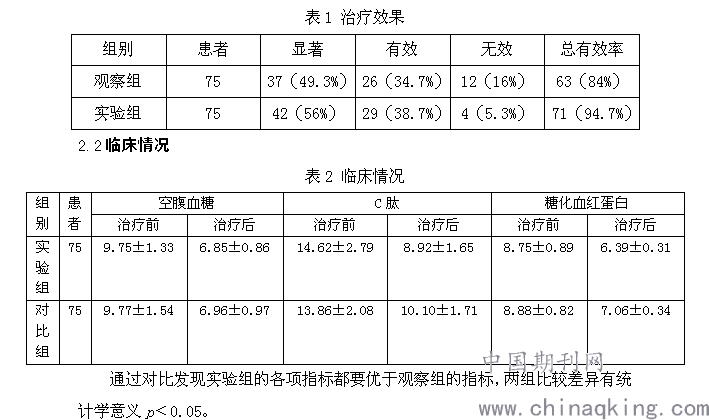 通过对实验组和观察组治疗前后血糖、糖化血红蛋白和C肽指标的记录,以及患者治疗后临床症状和血糖变化情况来对比治疗的效果,治疗效果分别是临床症状消失和血糖恢复正常水平(显著)治疗症状有明显好转和血糖有明显降低(有效);治疗后血糖和临床效果均无变化或病情加重(无效)。