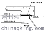 一般部位由于其普遍性,主要由穿墙螺栓对工字钢进行固定后,由拉杆与上部混凝土体进行拉结,斜拉上锚固点为框架梁或剪力墙板[2],不得锚固在悬挑梁上。具体施工方法及细部构造如图,。