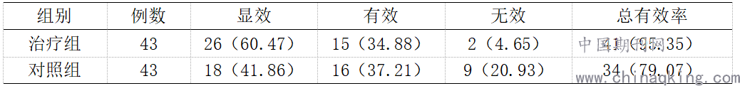 如表1所示,治疗组患者的治疗总有效率为95.35%,明显高于对照组患者的79.07%,差异有统计学意义(P<0.05)。