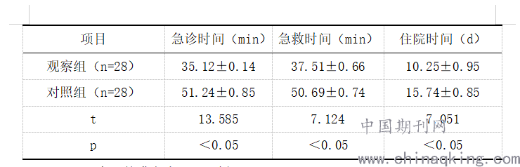 观察组患者的急诊、急救与住院时间均比对照组更短,结果差异明显,有统计学意义(P<0.05),详见表1: