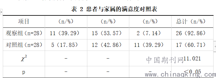 观察组患者家属满意人数为(P<0.05),详见表2:
