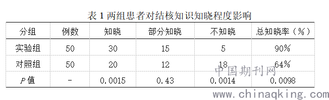 通过对照组常规护理治疗和实验组的强化护理观察治疗后,对照组50例患者的肺结核知识知晓患者20例,部分知晓的为12例,不知晓的为18例,总知晓率为64%。而经过护理干预治疗之后,耐肺结核患者的知晓例数30例,部分知晓的为15例,不知晓的为5例,总知晓率为90%,对比对照组,总知晓率显著性上升。对照组和实验组的知晓患者、不知晓患者、总知晓率之间具有显著性差异(p<0.05),实验组患者对肺结核知识的知晓程度增加明显。