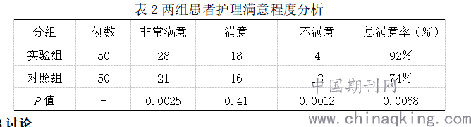 通过对照组常规护理治疗和实验组的强化护理观察治疗后,两组患者的护理满意程度不同。结果表明,对照组50例患者对护理程度非常满意的者21例,满意的16例,不满意的为13例,总满意率为74%。而经过护理干预治疗之后,实验组50例患者对护理程度非常满意的者28例,满意的18例,不满意的为4例,总满意率为92%。对照组和实验组患者对护理程度非常满意、不满意、总满意率之间具有显著性差异(p<0.05),具有统计学意义。