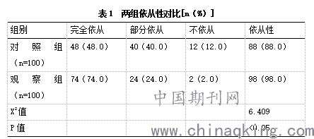 随访6个月,观察组和对照组的复发率分别为5.0%(5/100)、20.0%(20/100),并且与对照组比较,观察组的依从性高,组间对比差异有统计学意义(P<0.05),见表1。