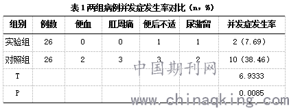 观察对照组和实验组患者的并发症发生率,包括:便血、肛周痛、便后不适、尿潴留。