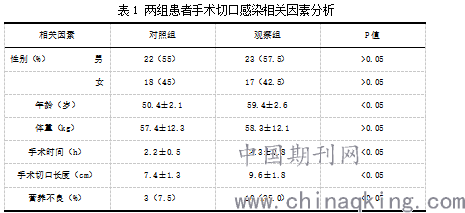 选取我院2018年1月-2019年12月期间在普外科接受手术治疗的患者80例作为研究对象,其中40例发生手术切口感染患者为观察组,40例未发生手术切口感染患者为对照组。观察组中有男性23例,女性17例,年龄36-78岁,平均年龄(59.4±2.6)岁;对照组患者中有男性 24例,女性16例,年龄18-75岁,平均年龄(50.4±2.1)岁。