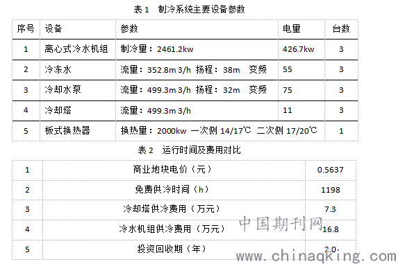 根据当地的气象局提供的气象参数,可用于冷却塔免费供冷的时间约1198h。表1为商业供冷系统主要设备参数,表2为商业供冷运行时间及费用对比。