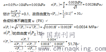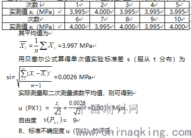 PX1的标准不确定度u(PX1)的来源主要是精密压力表的测量不重复性,可以通过重复性条件测量得到测量列,采用A类方法进行评定:取一台测量范围为0-6MPa,准确度等级为0.4级的弹簧管式精密压力表,在4 MPa压力点作了10次重复性测量,所得数据如表所示。