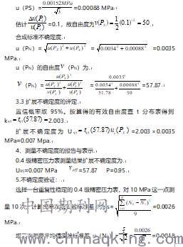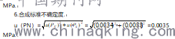 通过测量二等活塞式压力计下端面与被校仪表测压点的高度最大相差18cm,即h=18cm,由此引入的误差作为不确定度源,认为均匀分布(h在计算时以m为单位),a= gh=0.86×103kg/m3×9.8015m/s2×0.18m=0.00152 MPa