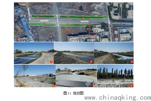 项目区属于阜新街西延退后绿化,位于高新区文光路与四平路东一路之间,项目区总用地约3.62公顷,其中现状中水水系面积为0.79公顷,新增设计面积为2.83公顷。两侧的绿带长约800米(不含规划道路),绿带控制宽度为30米。目前项目区东南侧为第四监狱,外围大部分区域尚未建设,均为空地。现状场地内部整体地势南高北低,东高西低,较为平坦。