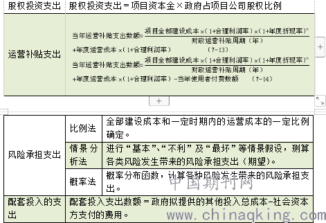 在进行财政承受能力论证过程中,需要对项目全生命周期内财政支出责任分别进行测算,从股权投资、运营补贴、风险承担、配套投入四个方面计算后求和。财政承受能力论证的方法如下表所示: