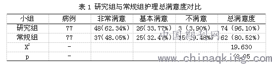 研究组护理总满意度高达96.10%;常规组护理总满意度高达80.52%。组与组之间结果具有显著差异(p<0.05)。详情见表1。