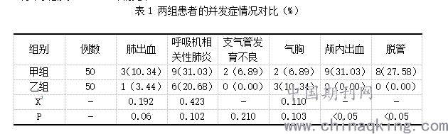 甲组和乙组的并发症情况比较,两组的肺出血、呼吸机相关性肺炎、支气管发育不良、气胸的发生情况没有明显差异,但甲组的颅内出血、脱管情况的发生要高于乙组,差异具有统计学意义P<0.05。详情见表1。