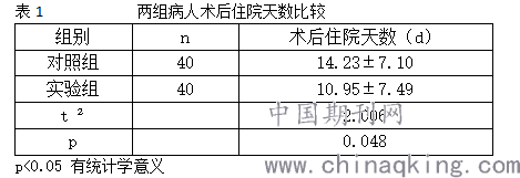 2.4 统计学方法 所得数据采用 SPSS 18.0进行统计分析,住院时间、术后并发症的发生率、 术后一个月的营养状况均采用两独立样本 t 检验,采用t检验和 x2检验,以p<0.05为差异具有统计学意义。