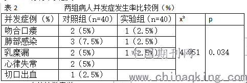 3 结果 采用集束化护理前后两组患者情况比较:术后住院天数实验组14.23±7.10,对照组10.95±7.49,(p=0.048,p<0.05),两组比较具有统计学意义,详见表1。术后并发症发生率,实验组为 7.5%(3/40), 包括吻合口瘘1例,乳糜胸1 例,肺部感染1 例, 对照组 25.0% (10/40),其中吻合口瘘 2例,肺部感染 3 例,心律失常 2 例,术后出血1 例,乳糜瘘2例,(x2=4.501,P =0.034,p<0.05),两组比较具有统计学意义,详见表2。手术一个月的营养状况,以入院时体重与BMI指数为标准,术后1个月内体重减轻>5%或BMI<18.5视为营养状况不佳,实验组为 5.0%(2/40),2例均为体重下降>5%,对照组12.5%(5/40),包括3例体重下降>5%,2例BMI<18.5,(P=0.432,P>0.05)。两组比较没有统计学意义,详见表3。