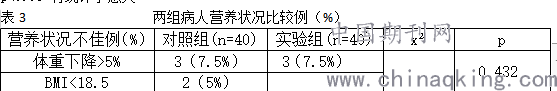 2.2 方法 对照组护理方法: 实施食管癌围手术期护理常规: ①入院时护士遵医嘱给予病人饮方面的指导。②术前一日按医嘱禁食禁饮。③手术当日置胃管。④术后根据胸外科护理要求做好各项导管护理。⑤ 术后全静脉营养,2-3天后开始肠道内营养补给然后过渡到口服饮食。⑥根据患者胃肠道功能恢复情况,肠道内饮食由少量生理盐水逐步过渡到肠内营养液再到流质。实验组在对照组常规护理的基础上实施集束化护理干预。①病人入院时使用《营养风险筛查NRS-2002评估表》进行营养风险筛查评分,≥3分给予相对应的饮食干预,比如口服营养素等。②快速康复外科理念认为鼻胃管、常规胸腔引流管、导尿管等都属对机体能产生刺激的装置[6],而“免管免禁”理念认为围手术期不留置胃肠减压管,可以减少手术创伤应激,缩短患者的康复时间[7]。所以实验组的患者术前一日流质饮食,术前晚不灌肠,手术当日酌情免置胃管。③手术当日起给予床头抬高30度的半卧位,研究表明低半卧位较去枕平卧位更能改善患者的呼吸、促进循环、利于引流[8]。术后一天根据患者自身恢复情况,指导早期离床活动。④术后第一天即开始肠内营养输注。肠内营养既为患者提供营养素,又不加重肠道负担,还可明显减少静脉补液量,从而减轻心肺负荷,减少食管癌术后呼吸、循环衰竭等并发症[9]。输注速度宜慢20-40ML/h,从第二日开始逐渐加快,调整范围在100-180ML/h。营养液的输注全部使用专门的营养袋和营养液输注泵,确保计量准确,输注匀速,以减轻胃肠道不适的症状。