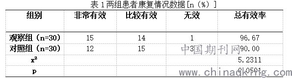 实验根据结果显示出观察组患者在护理期间的治疗效果相对于对照组较高,且差距明显(p<0.05)具有统计学意义。见表1。