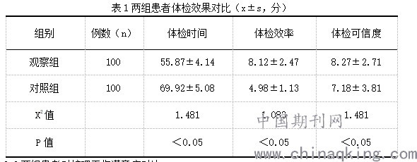 本研究显示,护理后,观察组患者体检时间、效率、可信度以及满意度均显著优于对照组患者各项评分,数据差异具有统计学意义,P<0.05;观察组患者对护理工作满意度97%,显著高于对照组患者对护理工作满意度90%,数据差异具有统计学意义,P<0.05。