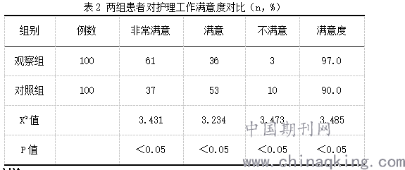 护理后,观察组患者对护理工作满意度97%,显著高于对照组患者对护理工作满意度90%,数据差异具有统计学意义,P<0.05,详见表2。