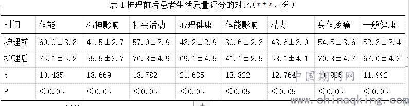 与护理前比较,护理后患者生活质量评分有明显提升,数据差异显著P<0.05。具体见表1。
