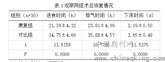 抽取2019年5月-2020年5月我院60例普外科手术患者,掷硬币后分组,康复组:有患者30例,男性17例,女性13例,年龄最小为22岁,年龄最大为65岁,平均年龄为(42.15±5.03)岁。对比组:有患者30例,男性16例,女性14例,年龄最小为21岁,年龄最大为66岁,平均年龄为(43.78±5.29)岁。两组差异不明显(P>0.05)。